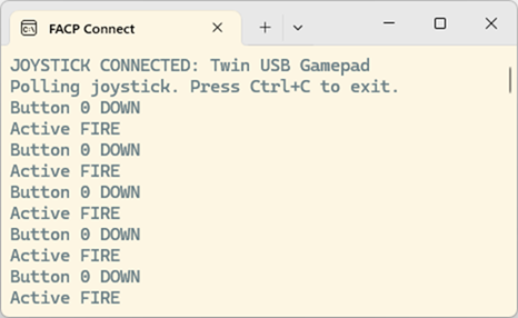 When FACP Connect has found and connected to a gamepad or joystick, it will display the following message, where <DEVICE TYPE> would be replaced with either gamepad or joystick (depending upon the actual type of connected device) and <Name> would be replaced with the actual name of the connected device: